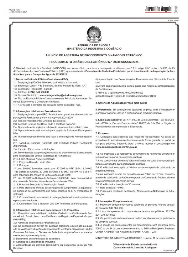 Anúncio De Abertura De Procedimento Dinâmico Electrónico Para Licenciamento De Importação De Fertilizantes Para A Campanha Agrícola 2024/2025.
