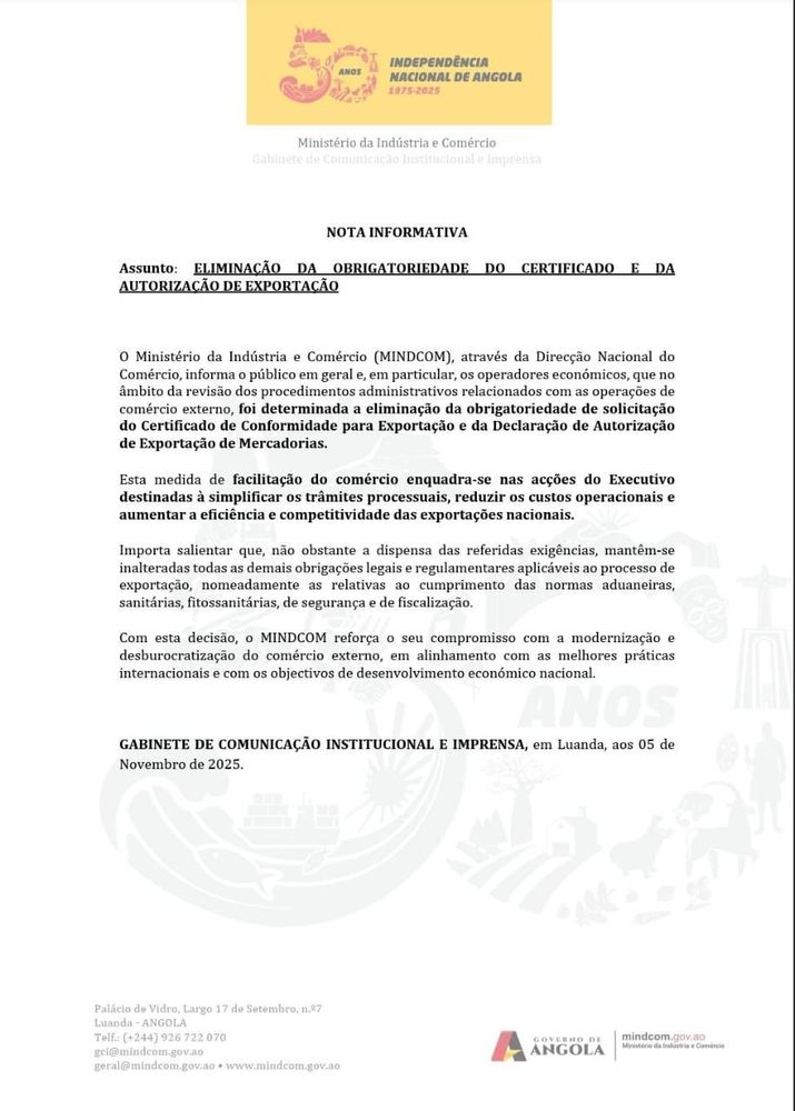O Ministério da Indústria e Comércio (MINDCOM), através da Direcção Nacional do Comércio, informa o público em geral e, em particular, os operadores económicos, que no âmbito da revisão dos procedimentos administrativos relacionados com as operações de comércio externo, foi determinada a eliminação da obrigatoriedade de solicitação do Certificado de Conformidade para Exportação e da Declaração de Autorização de Exportação de Mercadorias.