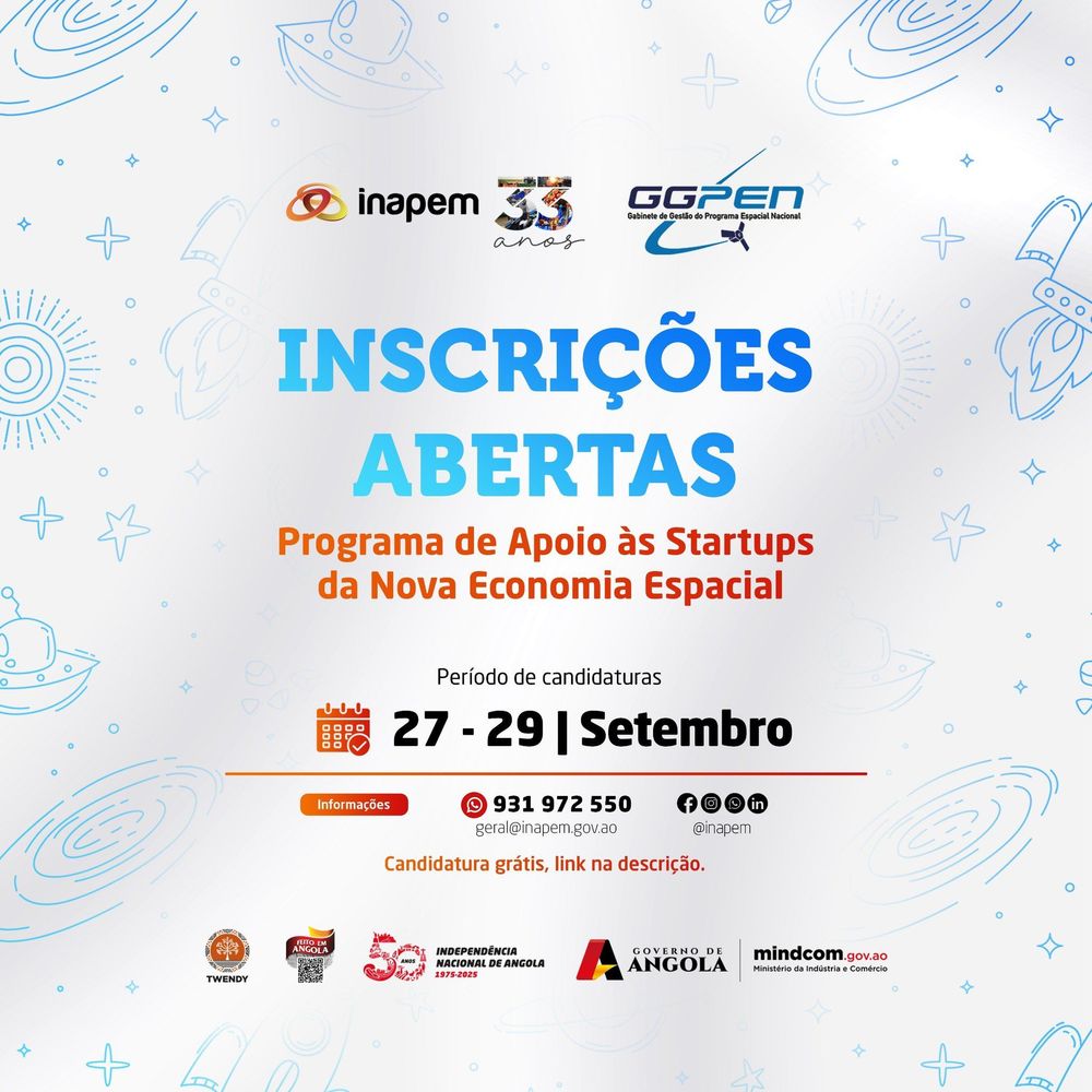 O INAPEM, em parceria com o CGPEN, anuncia a abertura das candidaturas para o Programa de Apoio às Startups da Nova Economia Espacial, uma iniciativa estratégica que visa fortalecer o ecossistema de inovação em Angola e promover soluções de conectividade e serviços baseados em tecnologias espaciais.