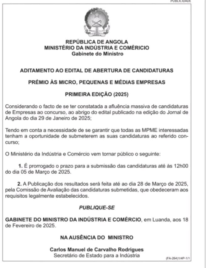 O Ministério da Indústria e Comércio informa que a data limite para a entrega de candidaturas à 1ª edição do Prémio Nacional às Micro, Pequenas e Médias Empresas, edição 2025, foi prorrogada para às 12 horas do dia 05 de Março de 2025.